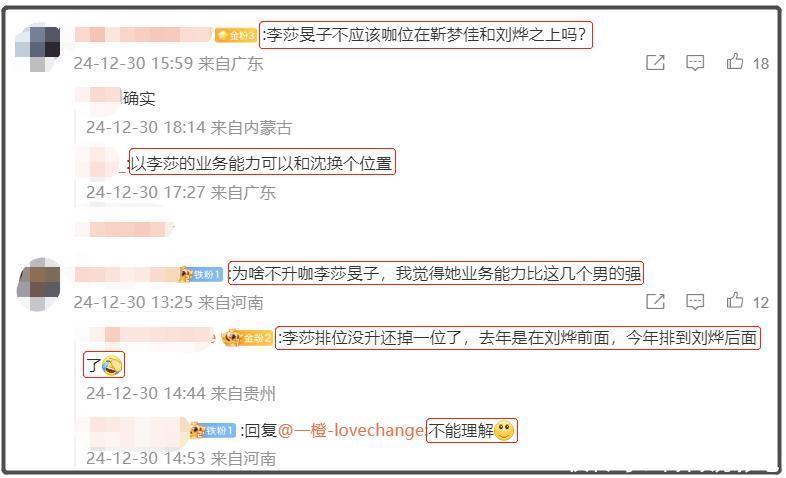 对于这样的咖位排名,很多网友表示并不理解。从业务能力、舞台实力、观众缘等多个维度来看,李莎旻子明显是更强的那一个,央视主持人大赛已经能说明一切。但她并不受重用,晚会待遇一年不如一年,四小花中直接掉队了,实力和咖位严重不匹配,这也是梁田选择出走的原因吧。